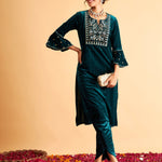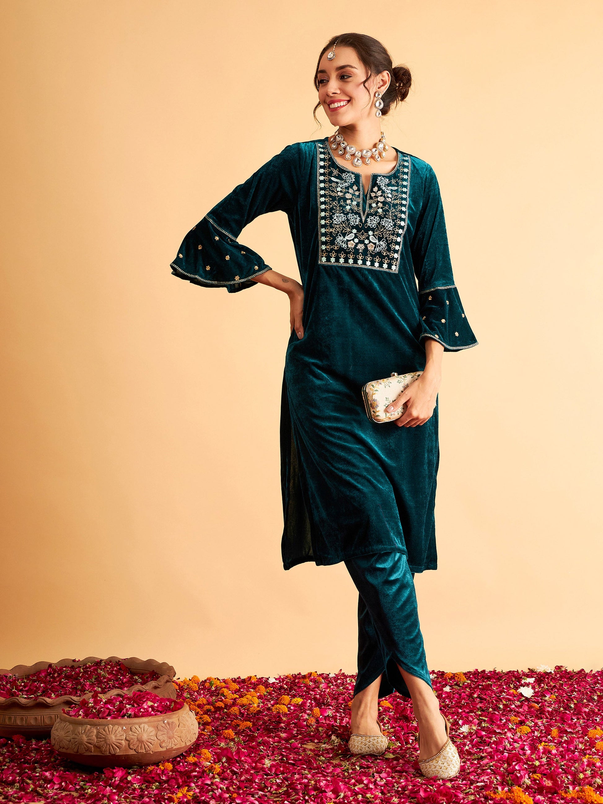 Green Velvet Flute Sleeve Embroidery Kurta , in Velvet fabric, Cotton Lining, Calf Length, Straight Fit, No Closure, Straight Hemline and features Zari Embroidery At Front Bodice And Sleeve Opening