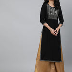 Rayon Black Calf Length Straight 3/4 Sleeve Round Neck Embroidered Kurta