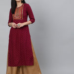 Rayon Wine Calf Length Straight 3/4 Sleeve Round Neck Embroidered Kurta