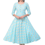 Cotton Printed Round Neck 3/4 Sleeve Flared Ankle Length Kurta