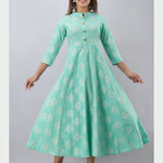 Cotton Printed Mandarin Neck 3/4 Sleeve Flared Ankle Length Kurta