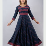 Cotton Printed Round Neck 3/4 Sleeve Flared Ankle Length Kurta