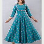 Cotton Printed Round Neck 3/4 Sleeve Flared Ankle Length Kurta