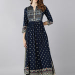 Rayon Block Print A-Line Kurta (Navy Blue)