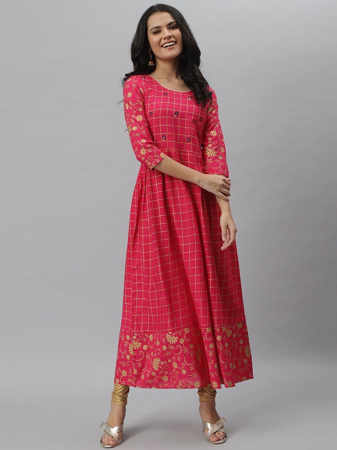 Checkered Rayon Flared Kurta (Pink) (Pre-Order)