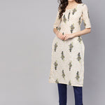 White Multi Colored Printed Straight Kurta With Solid Navy Blue Cigarette Pants