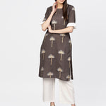 Grey Lotus Printed 3/4Th Sleeve Cotton Kurta With Off White Palazzo