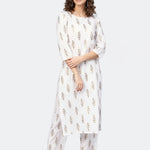 Off White 3/4Th Sleeve Cotton Printed Kurta With Printed Trouser