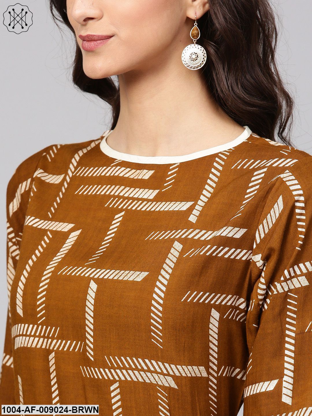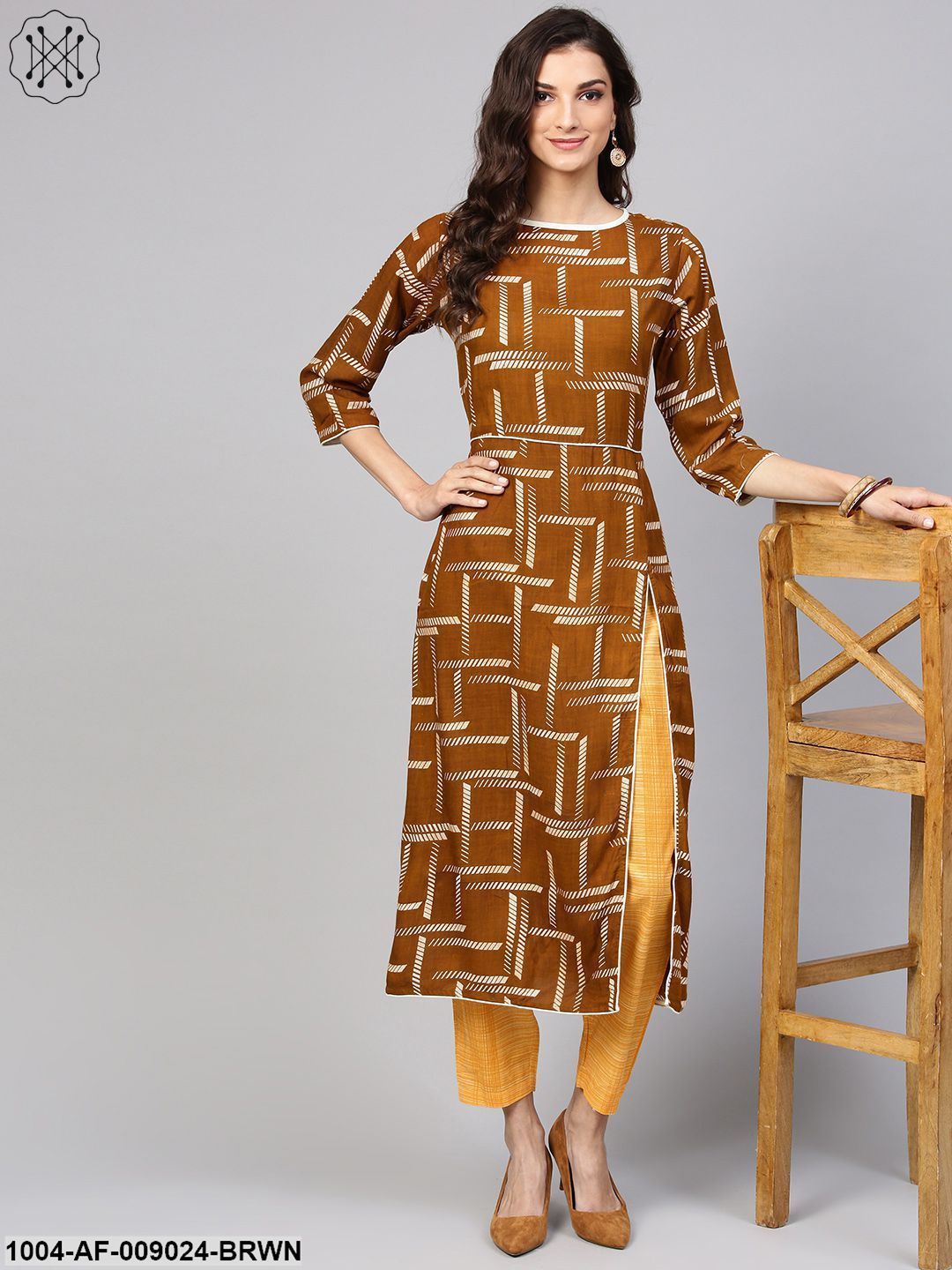 Dark Brown Printed Kurta Set With Contrasting Yellow Pants