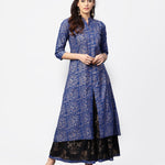 Blue Printed 3/4Th Sleeve A-Line Kurta With Black Flared Skirt