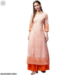 Peach Printed 3/4Th Sleeve Cotton A-Line Kurta With Orange Skirt