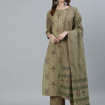 Women Olive Green Printed Straight kurta with Plazo & Dupatta