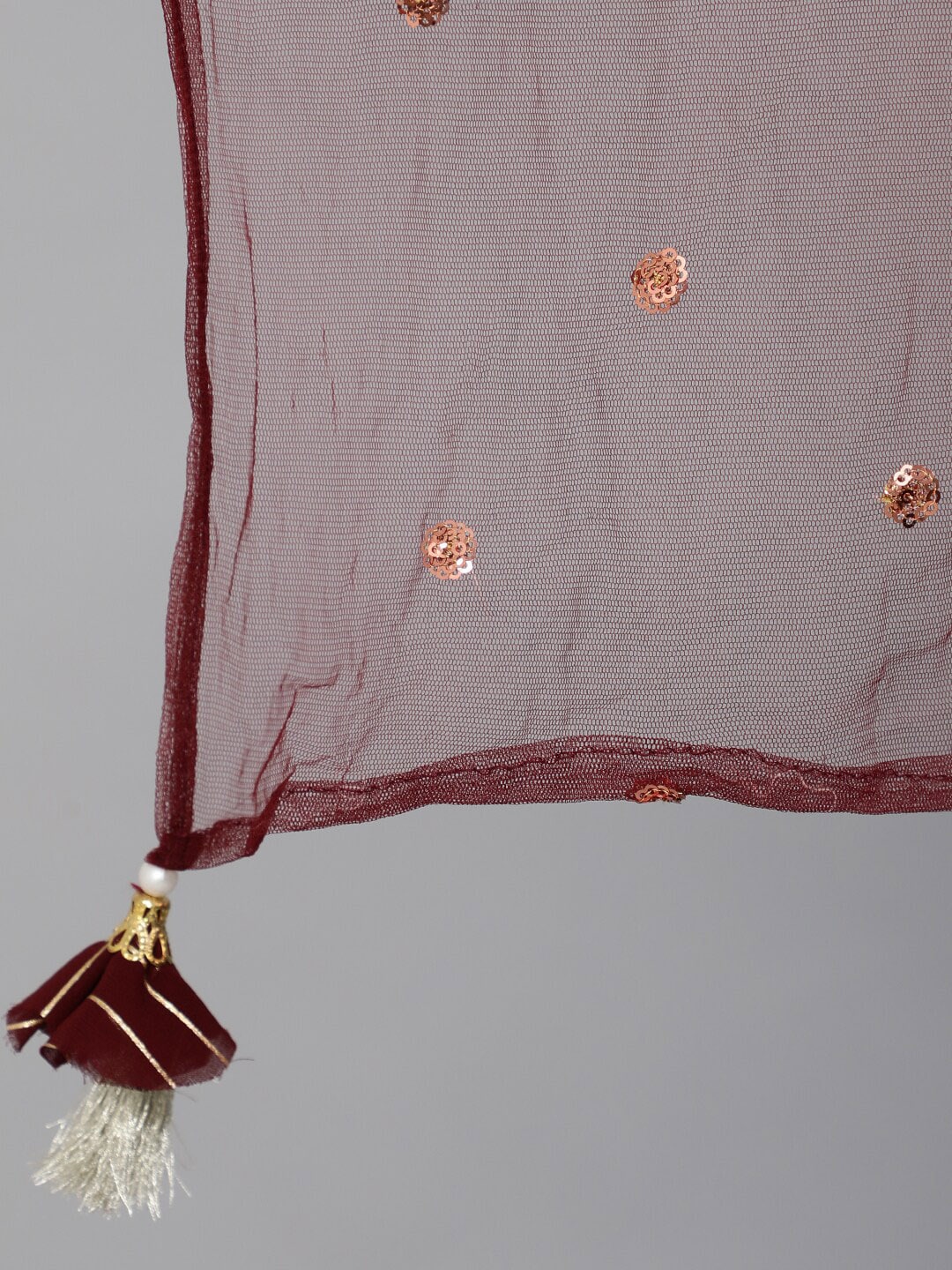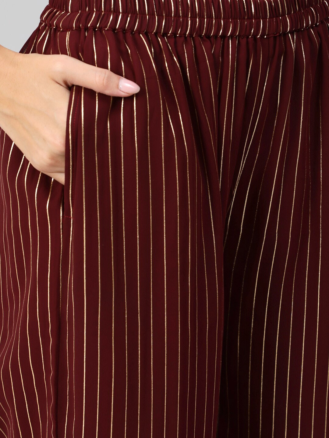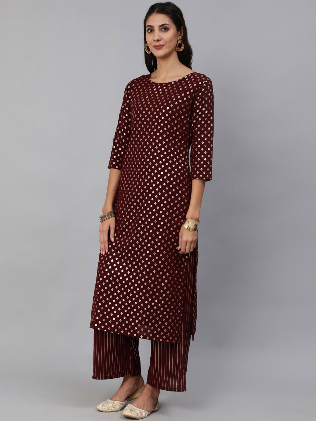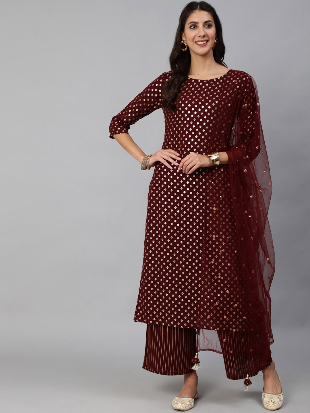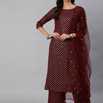 Women Maroon Geogrette Foil Printed Straight Kurta Set With Palazo & Sequence Dupatta