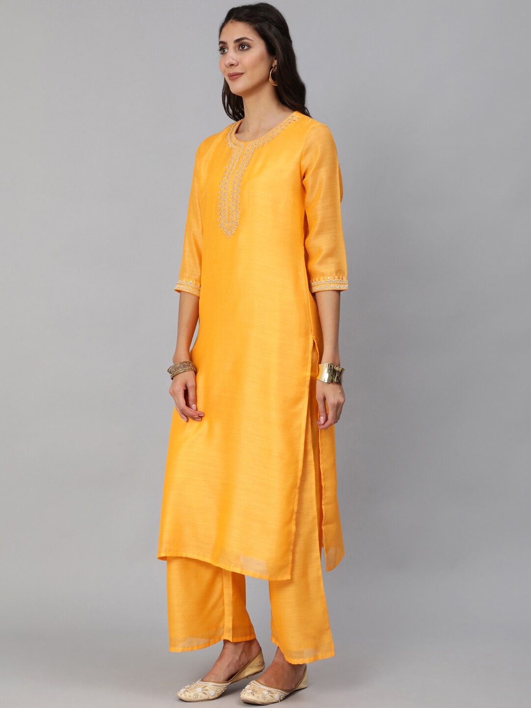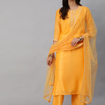 Women Yellow Chanderi Embroidered Straight Kurta Set With Palazo & Sequence Dupatta
