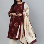Plus Size Women Brown & Gold Printed Straight Kurta With Palazo & Dupatta