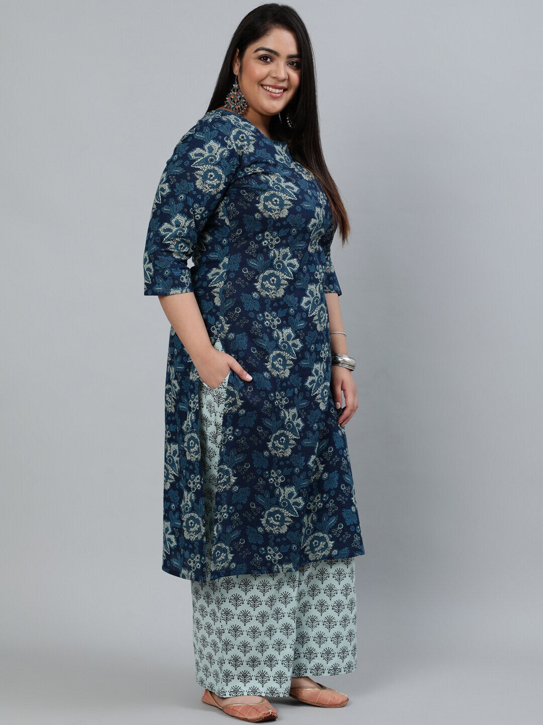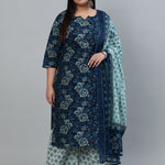 Women Indigo Blue Printed Straight Kurta With Palazo & Dupatta