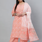 Plus Size Women Peach & Gold Printed Straight Kurta With Palazo & Dupatta