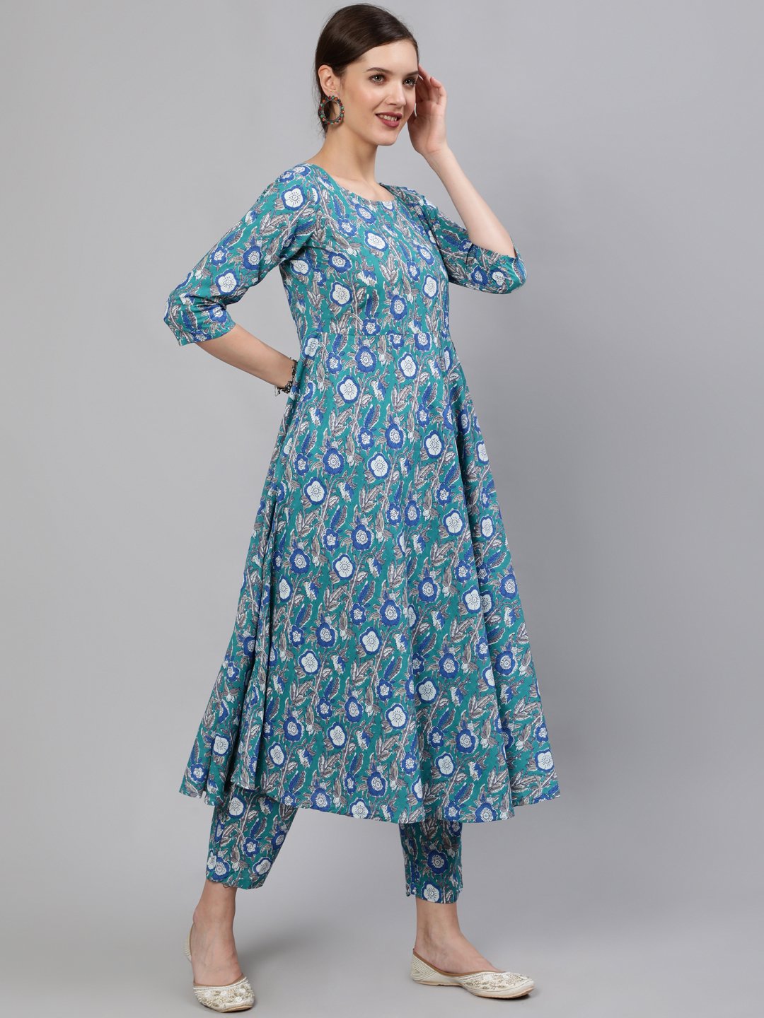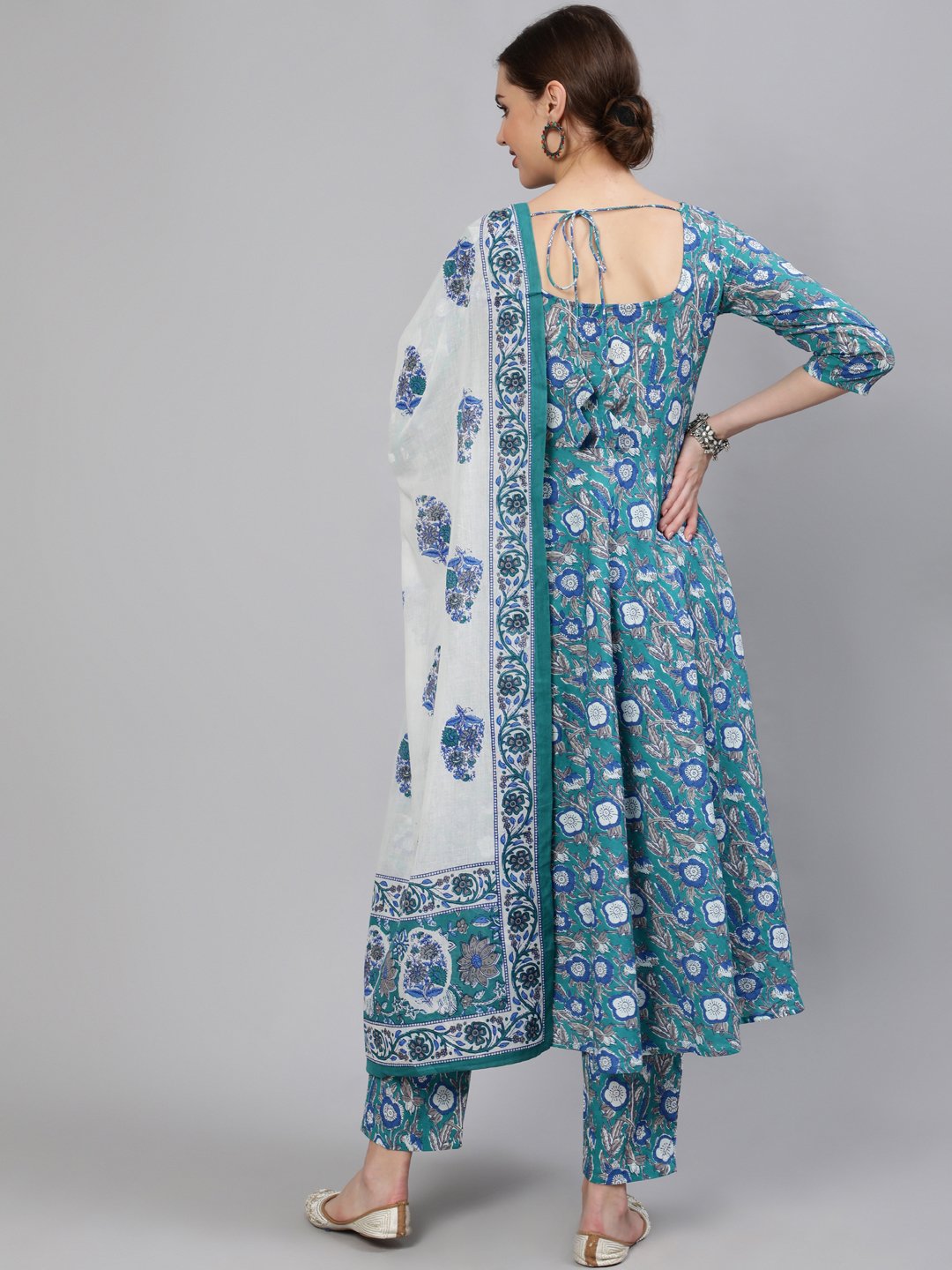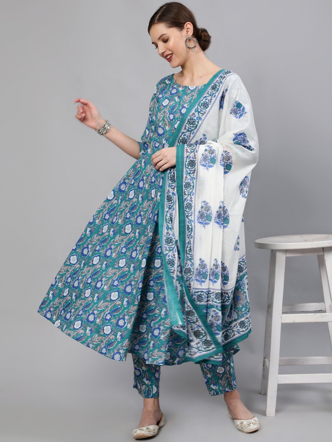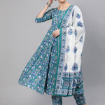 Women Blue Printed Flared Kurta With Plazo & Dupatta