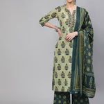 Women Green Printed Straight Kurta With Plazo & Dupatta