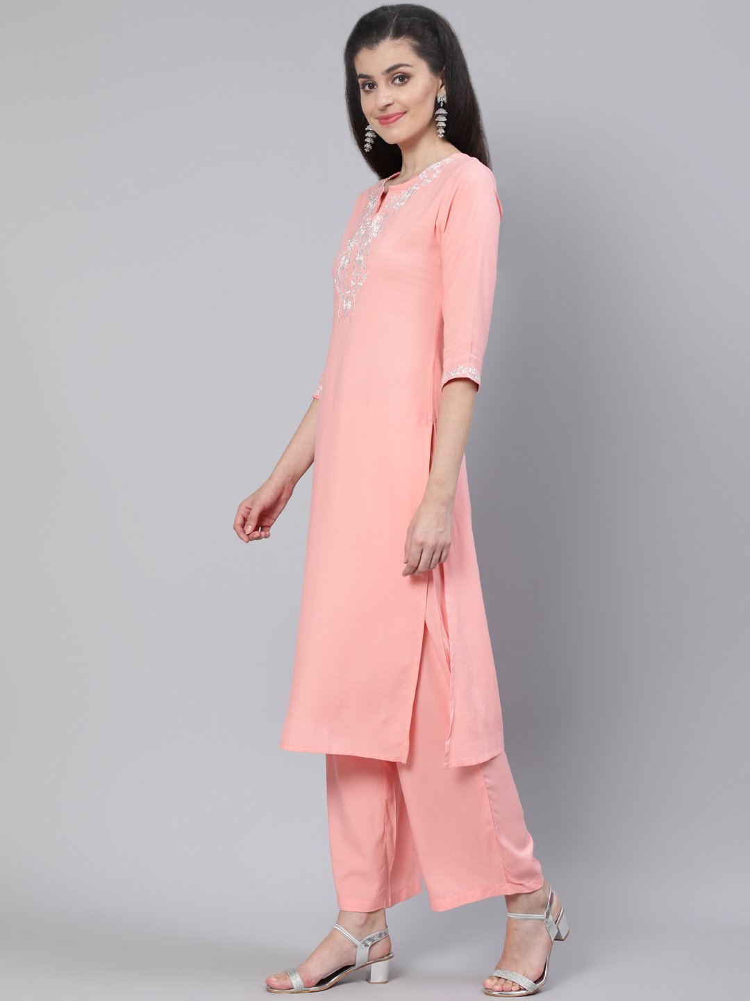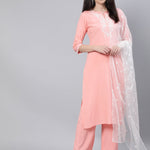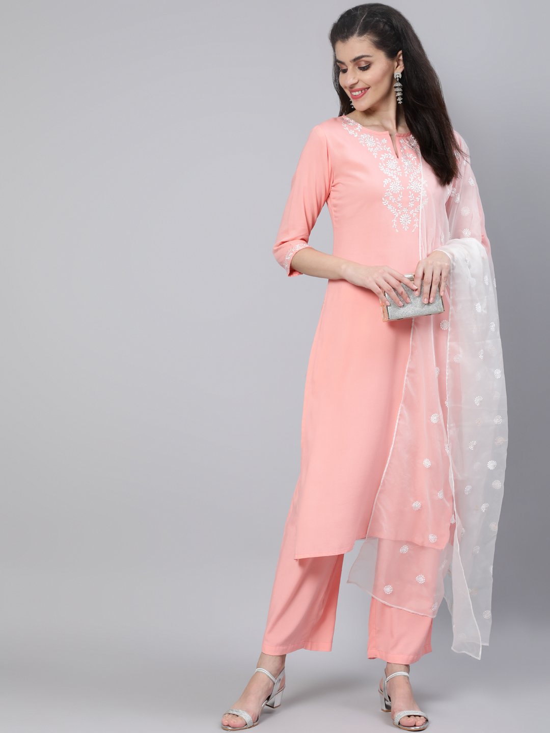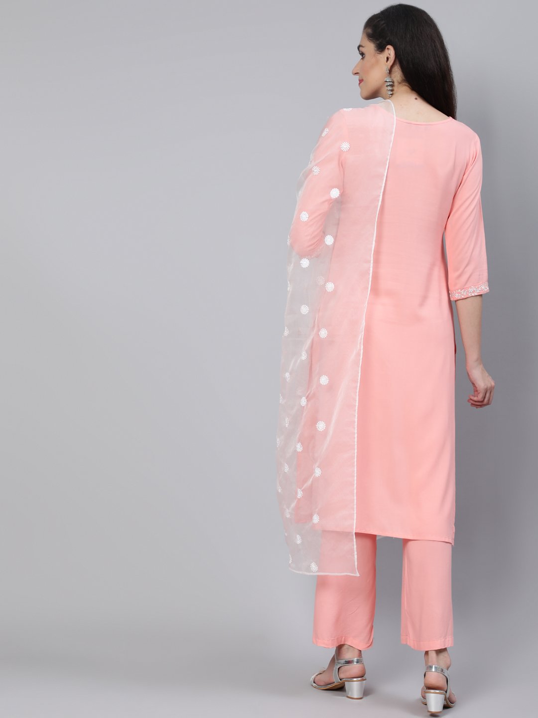 Women Pink Straight Kurta With Plazo & Organza Embroidered Dupatta