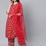 Women Red Straight Kurta With Plazo & Sequened Dupatta