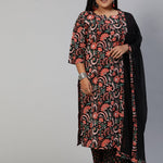 Women Black & Peach Printed Straight Kurta With Plazo & Dupatta