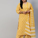 Women Yellow & Glitter Printed Straight Kurta With Plazo & Dupatta