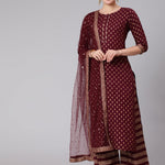 Burgundy & Gold Printed Kurta With Palazzo & Net Sequence Dupatta