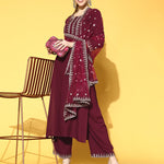 Burgundy Embroidered Straight Kurta With Plazo & Dupatta