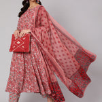 Pink Floral Printed Flared Kurta With Trouser With Dupatta