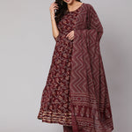 Burgundy Printed Flared Kurta With Trouser And Dupatta
