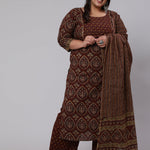 Plus Size Brown Printed Straight Kurta With Plazo & Dupatta