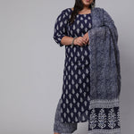 Plus Size Navy Blue floral Printed Kurta And Palazzo With Dupatta