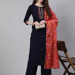 Navy Blue Embroidered Straight Kurta With Palazzo And Art Silk Dupatta