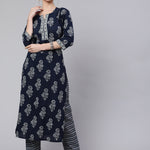 Navy Blue Ethnic Printed Straight Kurta With Trouser