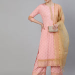 Rayon Zari Work Straight 3/4 Sleeve Round Neck Calf Length Kurta Set