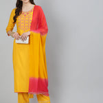 Rayon Embroidered Straight 3/4 Sleeve Round Neck Calf Length Kurta Set
