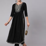 Rayon Calf Length Embroidered Flared 3/4 Sleeve Round Neck Kurta Set