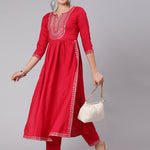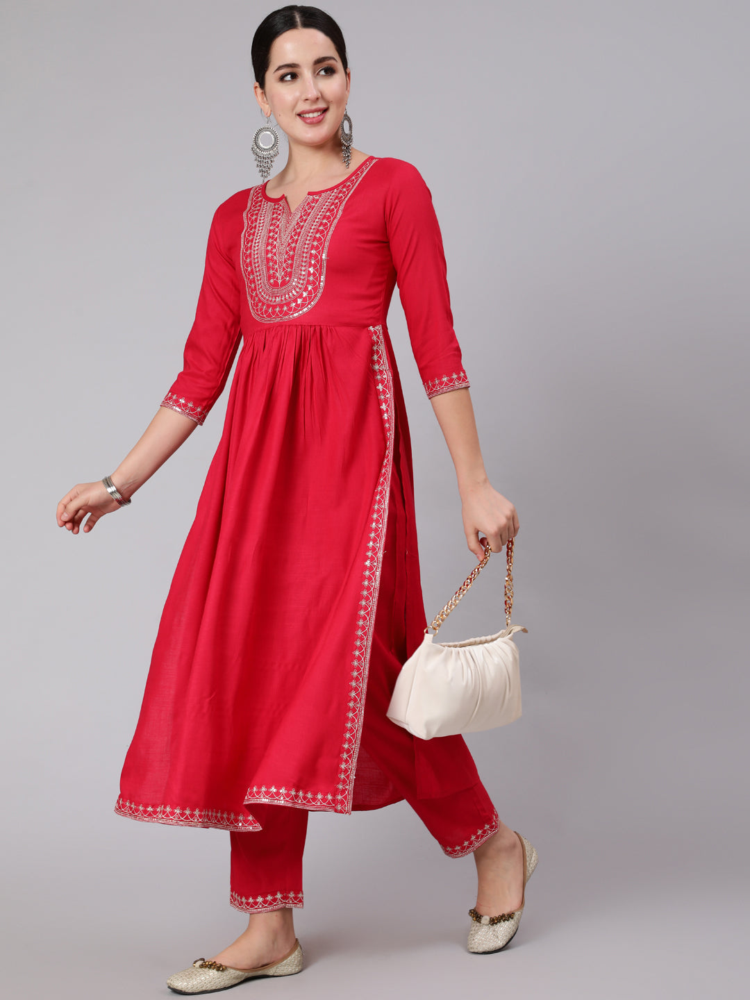 Rayon Calf Length Embroidered Flared 3/4 Sleeve Round Neck Set Kurta Set