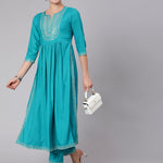 Rayon Calf Length Embroidered Flared 3/4 Sleeve Round Neck Set kurta Set