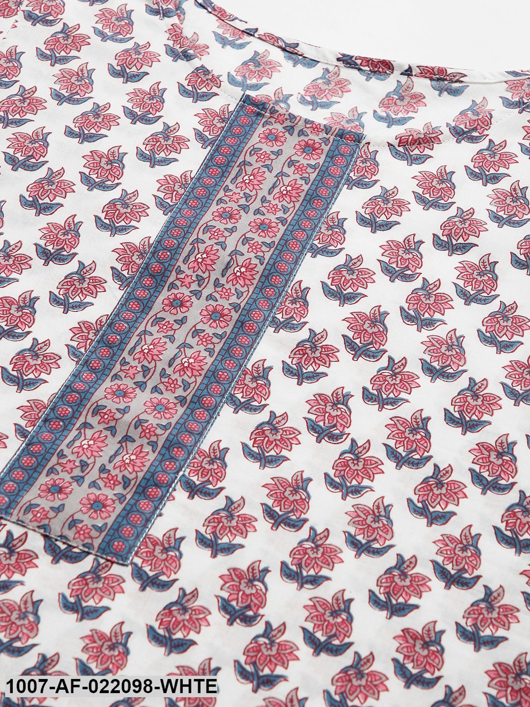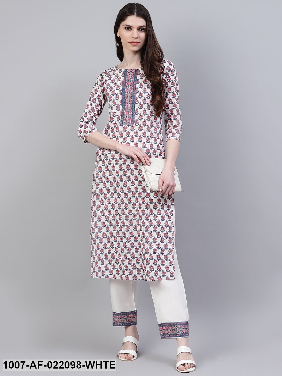 Women's Floral Print Cotton Straight Kurta Pant Set (White)
