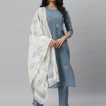 Women's Printed Cotton Straight Kurta Pant Dupatta Set (Denim Blue)
