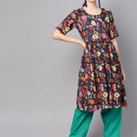 Navy Blue Multi Colored Pleated Kurta With Solid Tulip Pants