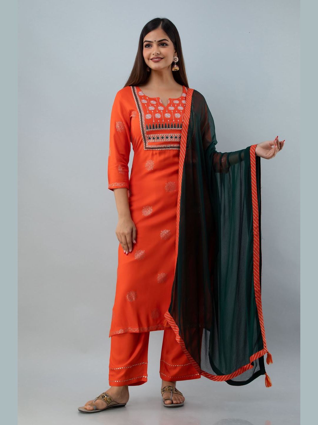 Embroidered Rayon Round Neck 3/4 Sleeve Straight Calf Kurta Set