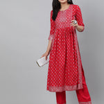 Rayon Coral Calf Length A-Line 3/4 Sleeve Round Neck Foil Printed Kurta & Pant Set