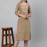Cotton Green Calf Length Straight 3/4 Sleeve Round Neck Printed Kurta & Pant Set