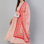 Printed Round Neck Calf Length 3/4 Sleeve Rayon A-Line Kurta, Palazzo & Malmal Dupatta Set