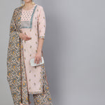 Printed Round Neck Calf Length 3/4 Sleeve Rayon Straight Kurta, Palazzo & Malmal Dupatta Set