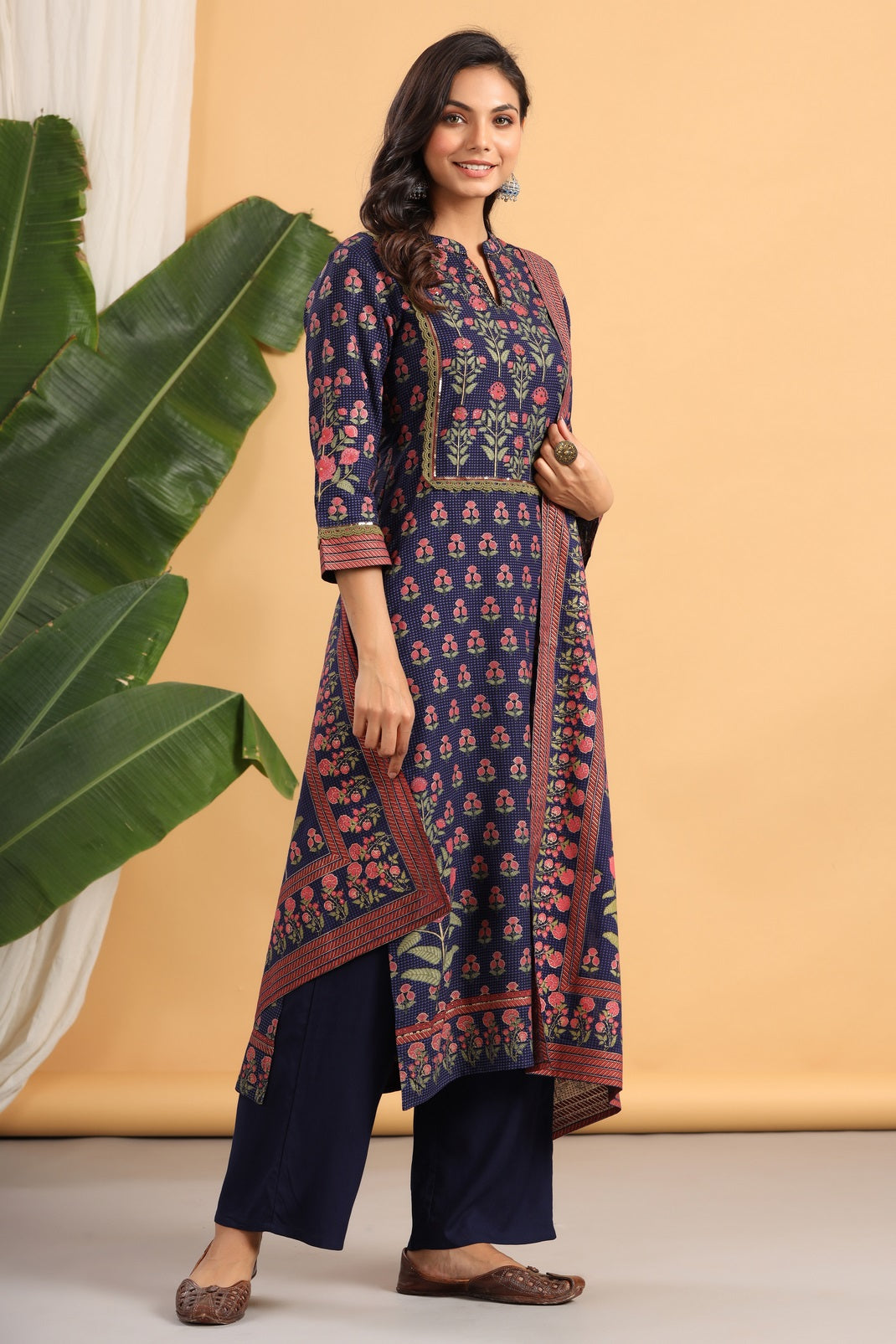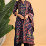 Navy Rayon Printed Straight Kurta Palazzo Dupatta Set