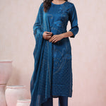 Blue Silk Printed Straight Kurta Pant Dupatta Set